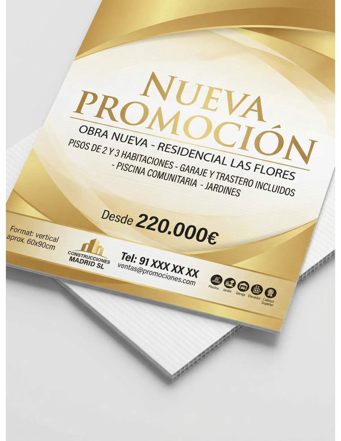 Carteles para inmobiliarias ligeros, resistentes a la intemperie. Impresos en color y fabricados en Polipropileno celular de 3000 mµ. Incluye 4 agujeros ollados para poder colgar.